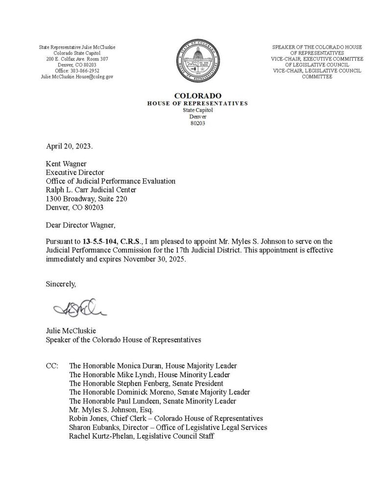 Denver, Colorado, April 20th: Speaker of the Colorado House of Representatives Julie McCluskie appoints Attorney Myles S. Johnson to serve on the Judicial Performance Commission for the 17th Judicial District. The Seventeenth Judicial District is one of the largest and fastest-growing districts in the state of Colorado. The District continues demonstrating its commitment to efficient and accessible justice through active judicial case management and oversight. This appointment is effective immediately and expires on November 30, 2025.