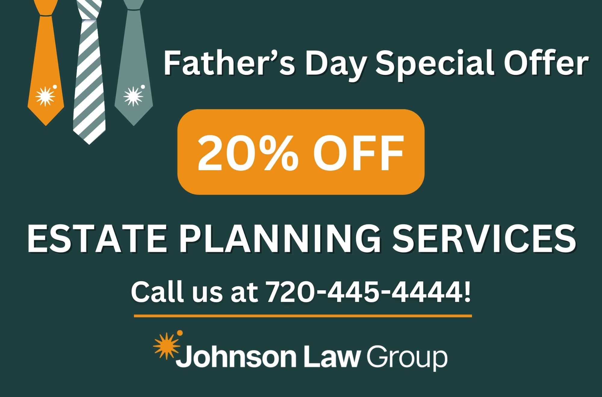 During June, we celebrate many things: our flag, Juneteenth, the summer solstice, and more, but none of these are as close to home for many of us as celebrating fathers. This Father’s Day, show your appreciation for your dad with a gift that truly matters: a comprehensive estate plan from Johnson Law Group. For a limited time, we’re offering 20% off our estate planning retainer to Colorado residents now through June 30th! This is a perfect opportunity for everyone, including dads, to ensure their wishes are respected and protect their families for the future.